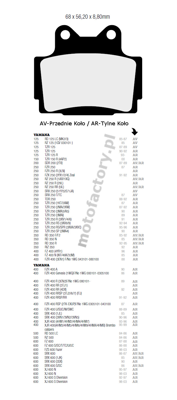 Aby precyzyjnie dobrać klocki hamulcowe do danego motocykla/skutera, prosimy o kontakt, bądź skorzystanie z
